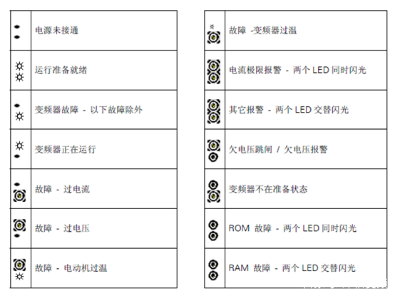 西門(mén)子變頻器的上,下兩個(gè)ALM指示燈有四種狀態(tài),分別是燈滅,長(zhǎng)亮,快速閃爍,和閃爍,分別代下以下含義:
