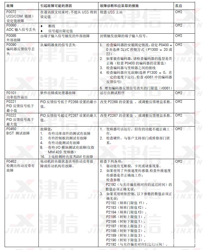故障信息以故障碼序號(hào)的形式存放在參數(shù)R0947 中(例如,F(xiàn)0003=3)。相關(guān)的故障值可以在參數(shù)R0949 中查到,如果該故障沒(méi)有相關(guān)的故障值,R0949 中將輸入0。而且,可以讀出故障發(fā)生的時(shí)間(R0948)和存放在參數(shù)R0947 中的故障信息序號(hào)(P0952)。