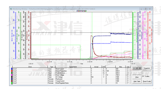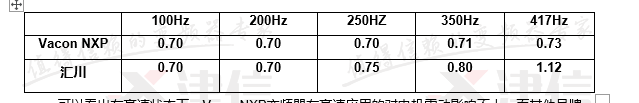 可以看出在高速狀態下,VaconNXP變頻器在高速應用的對電機震動影響不大,而其他品牌變頻器在高速應用時,會增加電機震動。高速應用在Vacon變頻器有完整的解決方案,NXP系列變頻器完全可以穩定應用在高速應用的場合,同時有良好的應用效果。