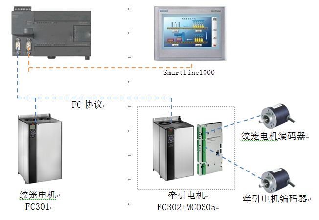 PLC的PORT1口與兩臺(tái)變頻器在一個(gè)總線上,采用FC協(xié)議進(jìn)行通信;PORT0則連接西門子的人機(jī)屏。其中牽引電機(jī)變頻器FC302上,安裝MCO305選件卡,同時(shí)將兩個(gè)電機(jī)的編碼器都接到MCO305上。由絞籠電機(jī)作為主軸,牽引電機(jī)作為從軸與主軸同步運(yùn)動(dòng)。