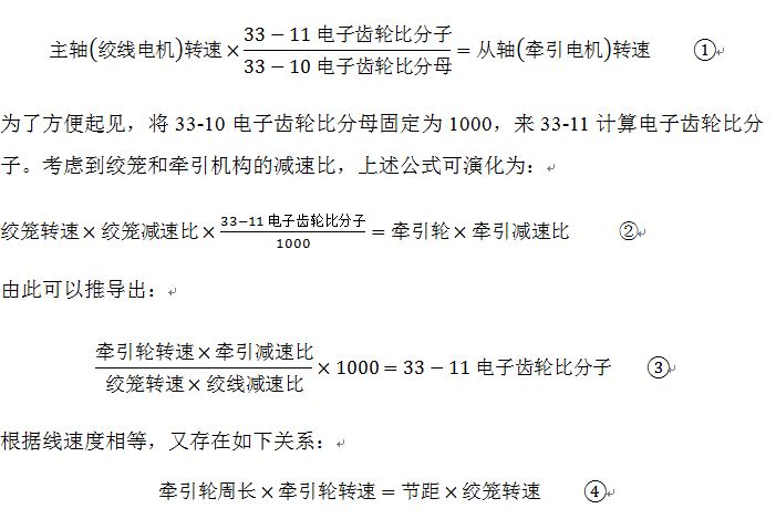 其中,絞籠轉(zhuǎn)速、節(jié)距由操作者給出,牽引輪周長(zhǎng)、牽引減速比和絞線減速比取決于機(jī)械結(jié)構(gòu),由以上公式④推導(dǎo)出牽引輪轉(zhuǎn)速并帶入公式③,即可求出電子齒輪比分子,在計(jì)算的過程中須保證單位統(tǒng)一,計(jì)算出的電子齒輪比分子轉(zhuǎn)化為整數(shù)并通過FC協(xié)議寫入FC302的33-11參數(shù)。