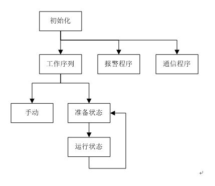 開機(jī)后,首先進(jìn)行通信和狀態(tài)的初始化。初始化完成后同時(shí)調(diào)用工作序列、報(bào)警和通信子程序。工作序列中,包含手動(dòng)和自動(dòng)兩種狀態(tài),自動(dòng)運(yùn)行又包括機(jī)組準(zhǔn)備(包括:松開機(jī)械抱閘、關(guān)閉防護(hù)門等動(dòng)作)和機(jī)器運(yùn)行兩個(gè)狀態(tài)。報(bào)警程序用于對(duì)機(jī)器狀態(tài)進(jìn)行實(shí)時(shí)監(jiān)控,并根據(jù)故障情況執(zhí)行相關(guān)動(dòng)作。通信程序用于PLC和變頻器的FC協(xié)議通信。