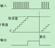 計數(shù)器的工作時序圖如圖二,當產(chǎn)品數(shù)量計數(shù)到達預設值時,計數(shù)器數(shù)字量輸出信號動作,中止主機運行。等用戶將計數(shù)器復位以后,主機又可以再次運行。