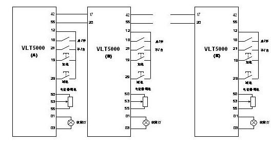 在工業輸送設備中,需要按照一定的速比實現多臺電機聯動。以往要實現此功能大都是通過機械裝置來完成,電氣方面的解決方案往往依靠大量的PLC模擬量模塊來實現,使得系統存在靈活性低、維護工作量大、工藝復雜、成本較高、安裝困難等缺點。通過采用丹佛斯VLT5000系列變頻器,我們有了新的解決方案。