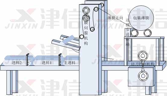 枕式包裝機主體基本上有送料部分、送膜部分和裁切部分構成,如圖1所示。所有的動作邏輯及相位控制均以主送料軸的主軸編碼器信號為參考進行控制。本文將就臺達A2伺服內置電子凸輪功能的應用加以闡述。其內置電子凸輪功能,具有低成本和高靈活性的優勢。