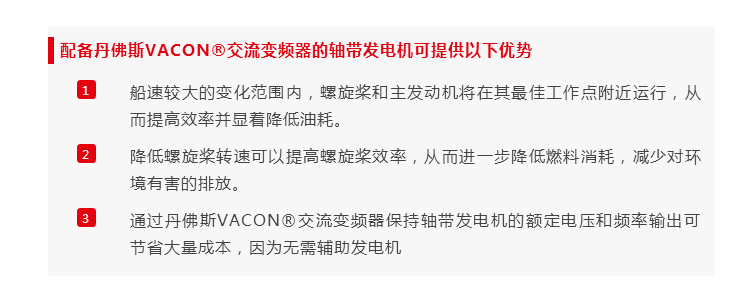 M/V Bore Sea上的軸帶發電機的主要原理。丹佛斯VACON®有源前端 (AFE) 單元和船舶電網上的LCL濾波器(以及專用軟件)一同構成了VACON® NXP電網變流器。